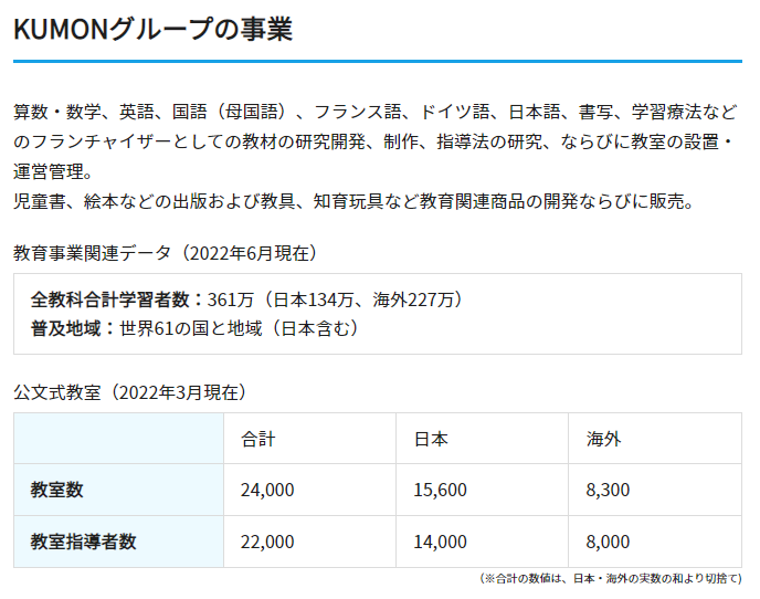 子ども達は本来、自分から伸びようとする力を秘めています。読み・書き・計算に取り組む過程で「やればできる」という自己肯定感を育み、「自ら学ぶ力」を育てていく。子ども達が将来自己実現を成しとげ、どんな時代でも夢や目標に向かってチャレンジしていける力、すなわち自分で自分の人生を切り開いていく「生きる力」を育てること。それがKUMONが考える教育です。父親のわが子への愛情から生まれたKUMONは、人から人へ、街から街へと広がり、今では言葉や文化・歴史の壁を越え、世界の国々に広がり続けています。
