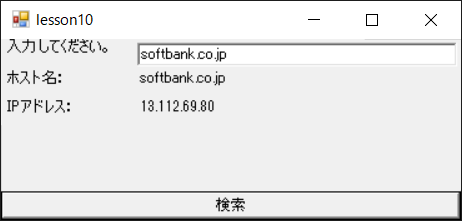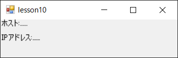と言う処理をしています。画面上に、ホスト名とIPアドレスが表示されることがわかります。ここではアドレスリストのうち最初のアドレスを表示することにしています。