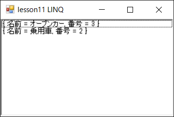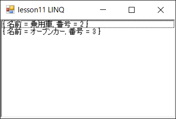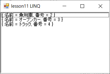 IEnumerable qry = from K in 車表 where K.番号 <= 3 select new { K.名前, K.番号 };