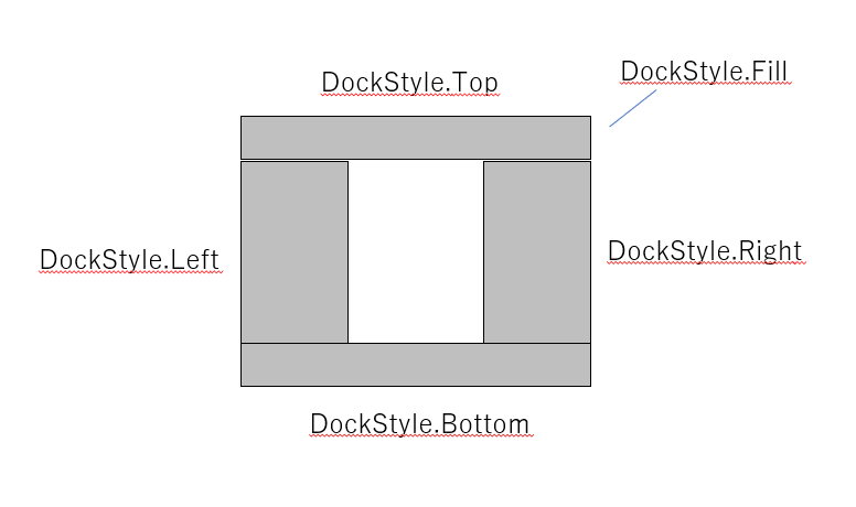 なお、ここではフリーレイアウトパネルのDockプロパティをDockStyle.Fillという値を指定しています。Dockプロパティはそれがおかれるコントロールにどのようにドッキングされるか示したものです。DockStyle.Fillは大きさいっぱいに張り付く値となります。つまりここでは、フォームいっぱいにフローレイアウトパネルが張り付いていることにになります。