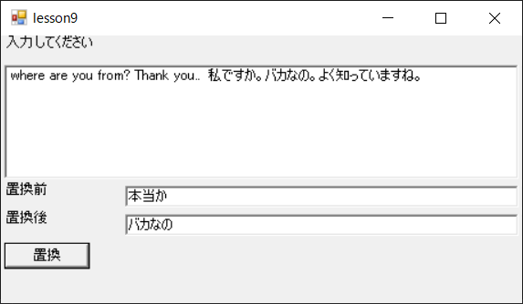 プログラムを実行しテキストボックスにテキスト入力してください。さらに置換前の文字列と置換後の文字列を入力し、「置換」ボタンを押します。すると指定した文字置換前文字列が置換後の文字列に全て置換されます。