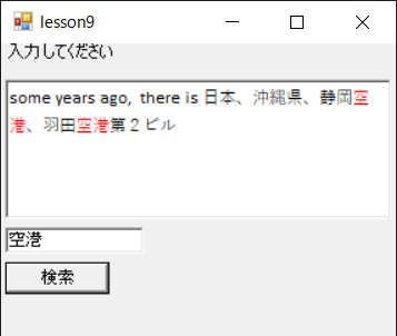 文字色を変更するために、リッチテキストボックス(RichTextBox)コントロールを使っています。検索単語見つかるたびにマッチした範囲の選択を行い、文字の選択色を変更しています。