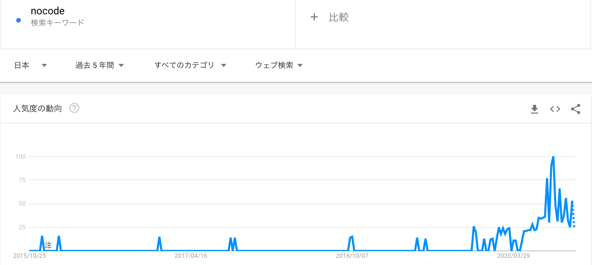 日本における“nocode”の検索推移(過去5年間、Googleトレンドより抽出)。ここ1年ほどで、nocodeの検索が急増していることが読み取れる