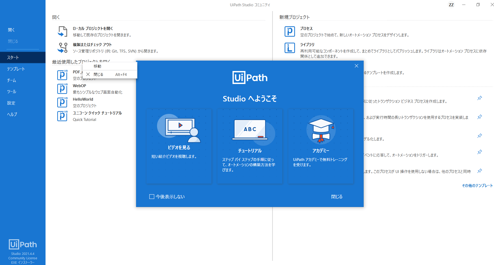 - https://cloud.uipath.com/ポータル画面からDownload UiPath Studio