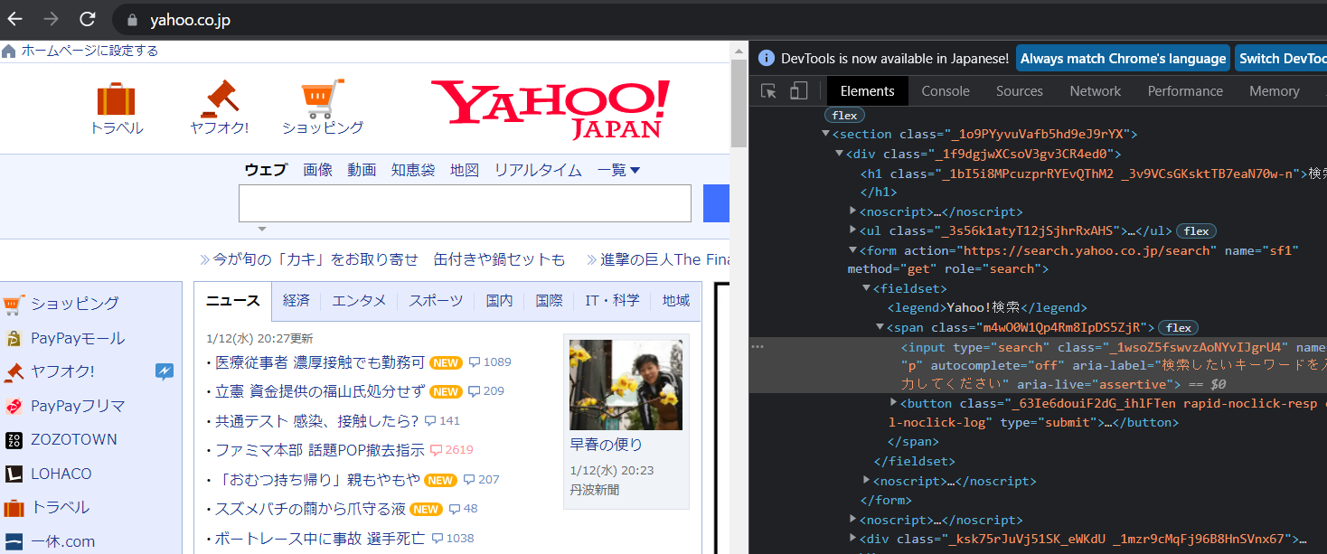 F12ボタンを押し、Chromeの開発者ツール(ディベロッパーツール)からウェブ要素を確認することができます。