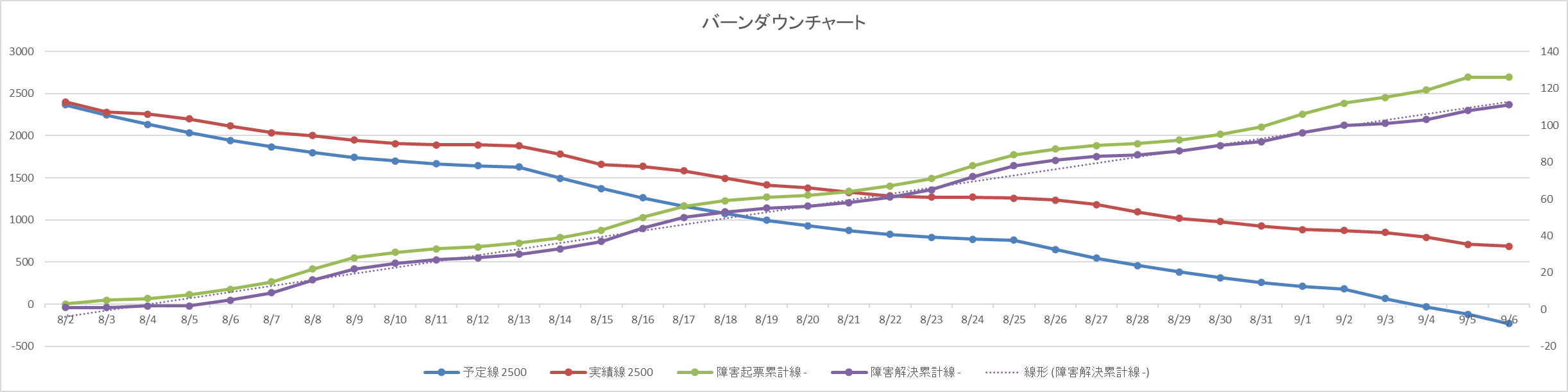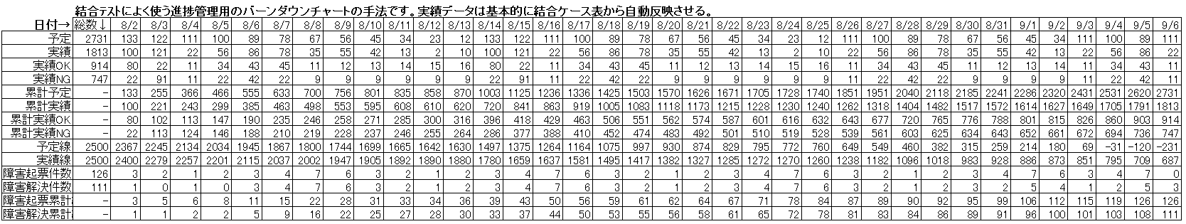 エクセルでデータを纏める時に、日々のスプリントと累計スプリントを集計する。予定線、実績線、累計予定線、累計実績線、進捗結果OK/NGも可視化必要な場合は実績OKと実績NGに分ける。スプリント消化の同時に、不具合も増えるので、不具合のバーンアップチャートも一緒に作ることがある。