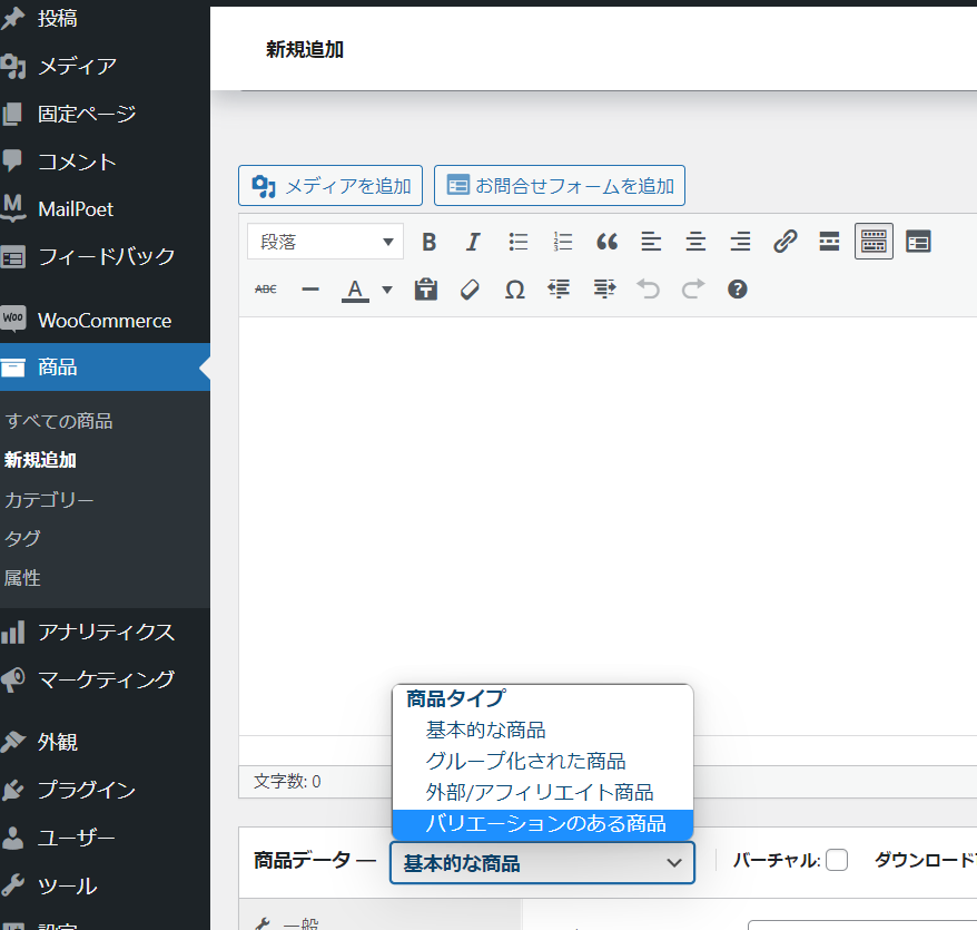 WooCommerce > 商品 > 新規追加 > 商品タイプ(バリエーションのある商品)