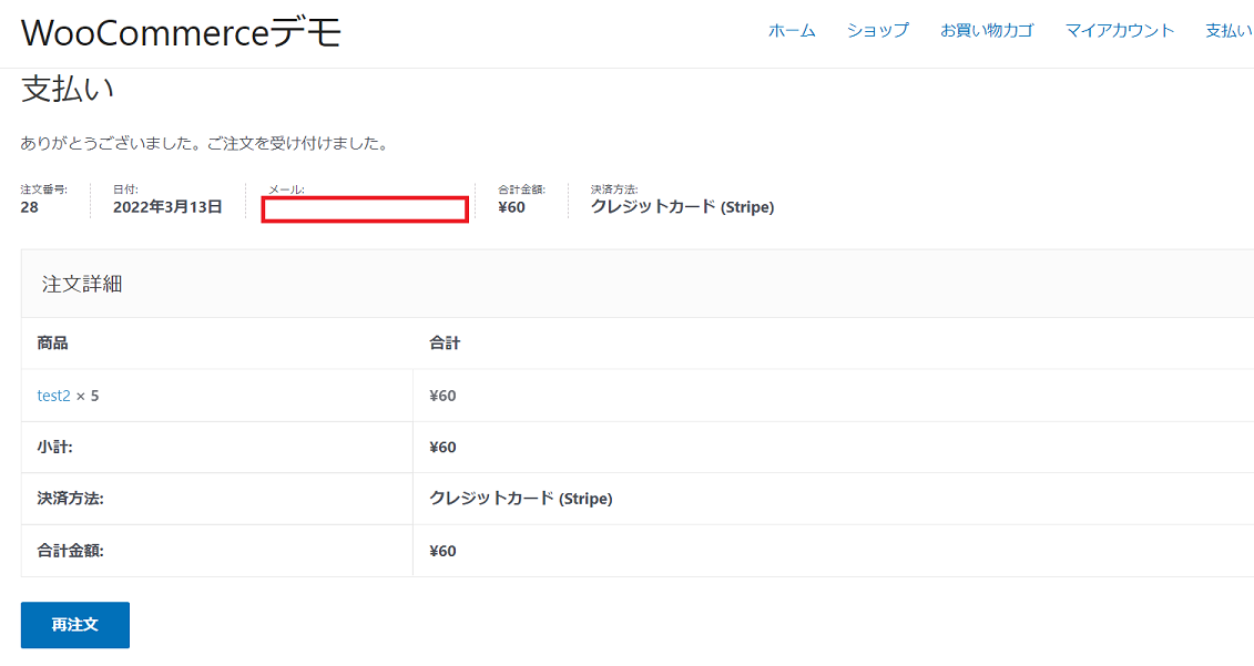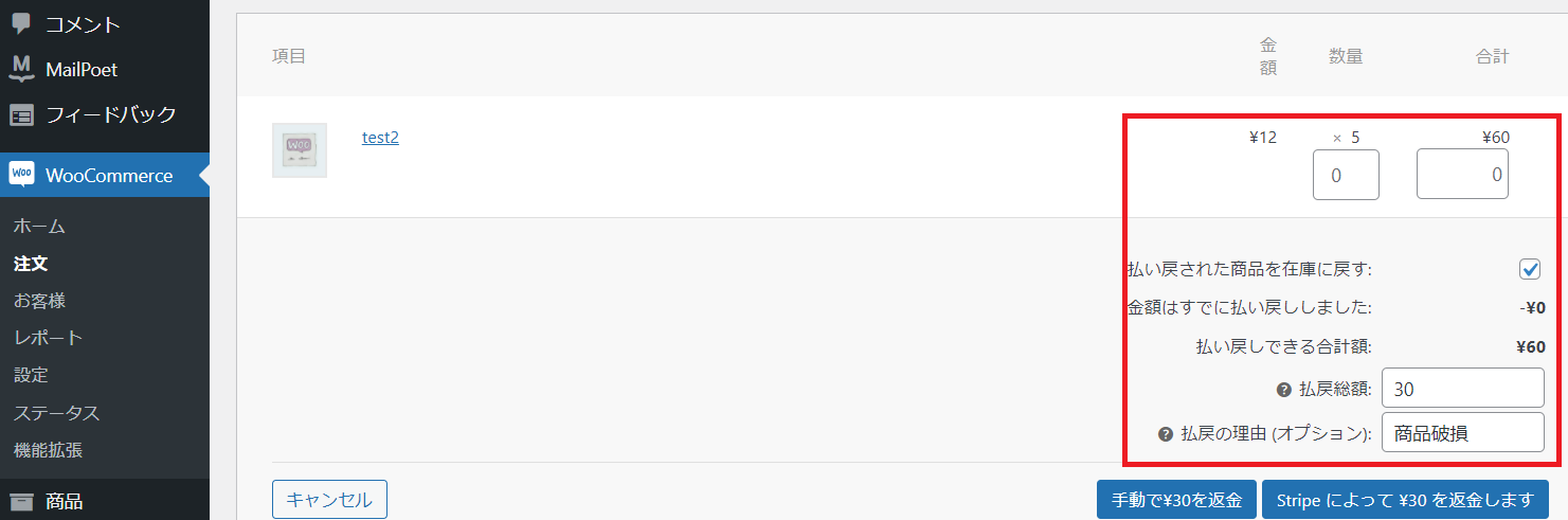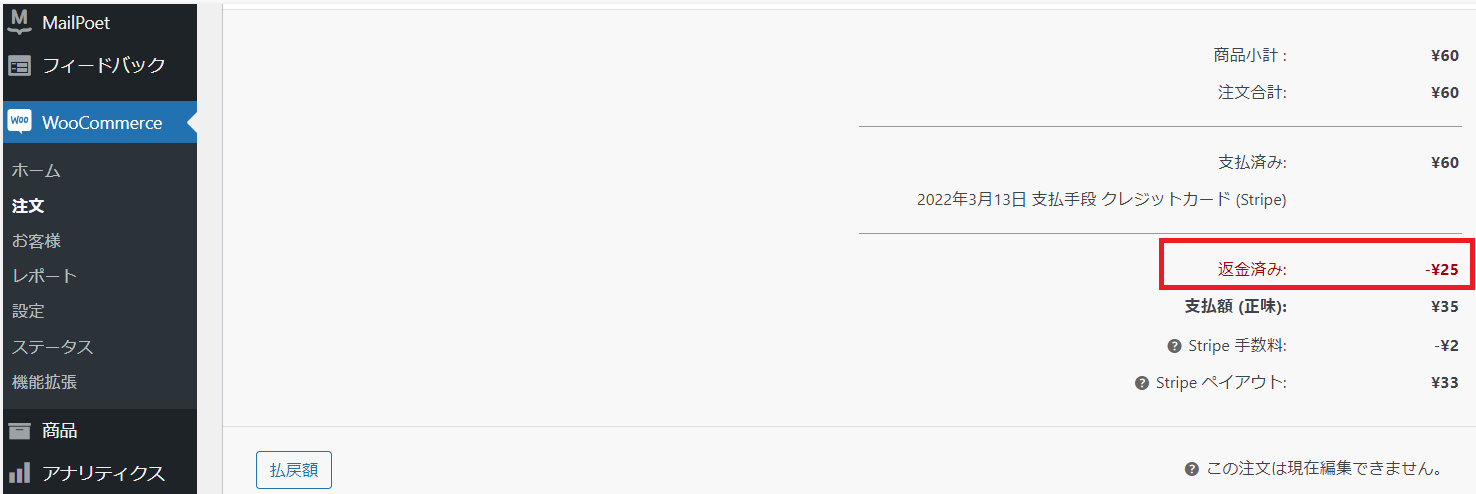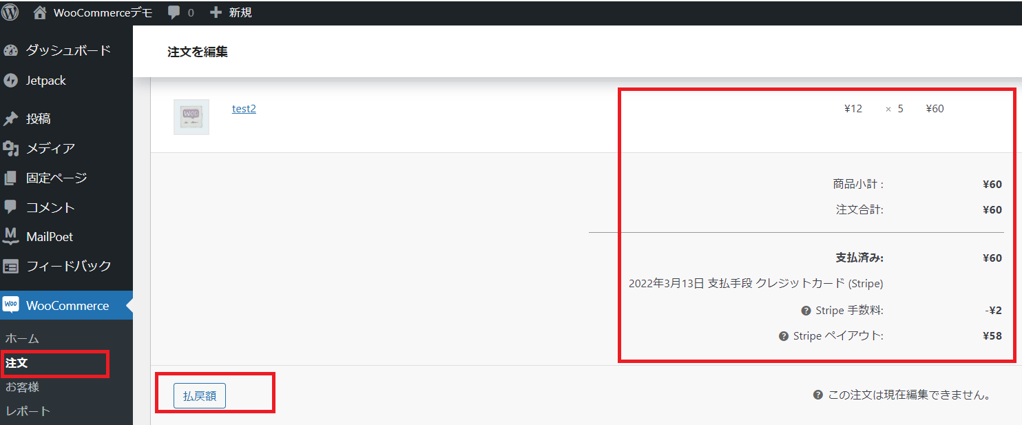 [WooCommerce] > [注文] の注文一覧から、返金をしたい注文を選択して注文詳細ページに移動します。 ページの下の方にある [払戻額] のボタンを押します。