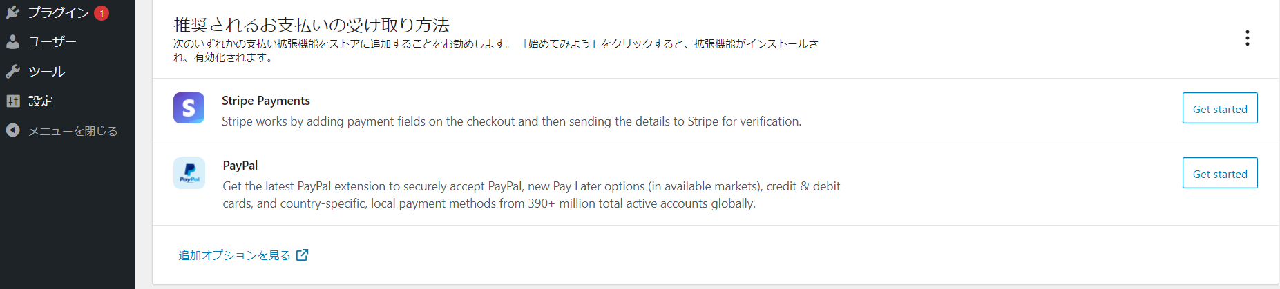 次のいずれかの支払い拡張機能をストアに追加することをお勧めします。 「始めてみよう」をクリックすると、拡張機能がインストールされ、有効化されます。