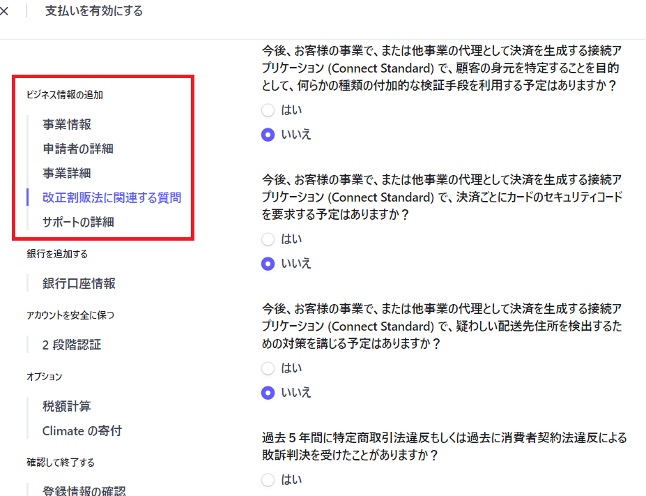 Stripeサイトで必要な情報を入力し、アカウントを作成する。注意してほしいところは手数料3.6%かかります。