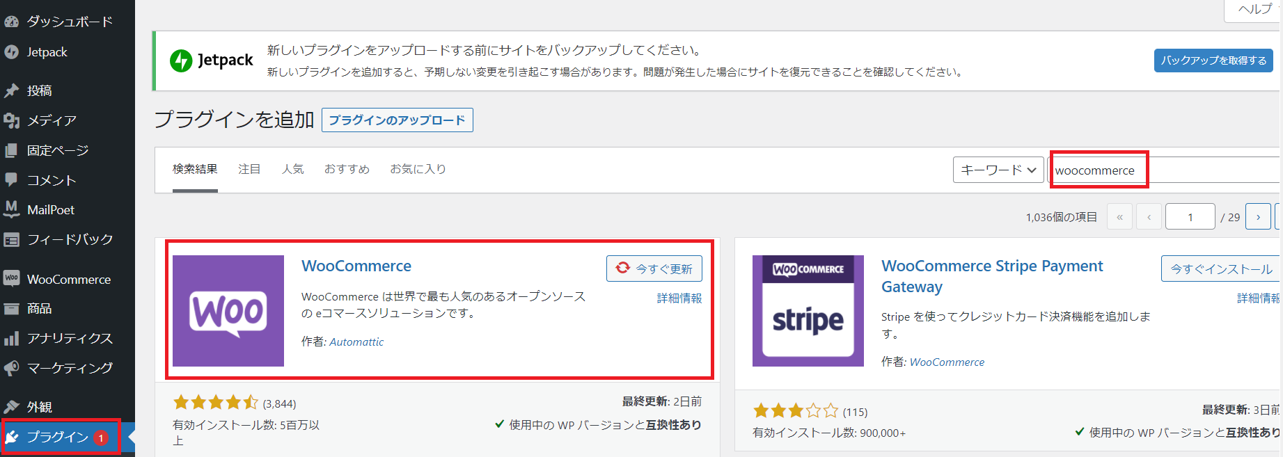 決済代行サービスを利用するには、ダッシュボードのプラグイン>新規追加から、以下のプラグインのインストール・有効化が事前に必要ですので行ってください。WooCommerceが用意している無料のプラグインです。